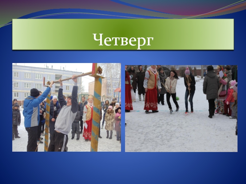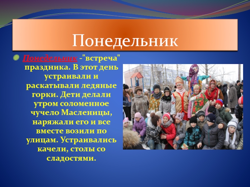 Понедельник -"встреча" праздника. В этот день устраивали и раскатывали ледяные горки.