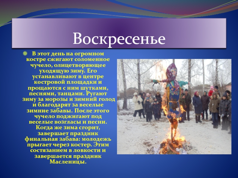 зиму. Его устанавливают в центре костровой площадки и прощаются с ним шутками, песнями, танцами. Ругают зиму за морозы и зимний голод и благодарят за веселые зимние забавы. После этого чучело поджигают под веселые возгласы и песни. Когда же зима сгорит, завершает праздник финальная забава: молодежь прыгает через костер. Этим состязанием в ловкости и завершается праздник Масленицы.
