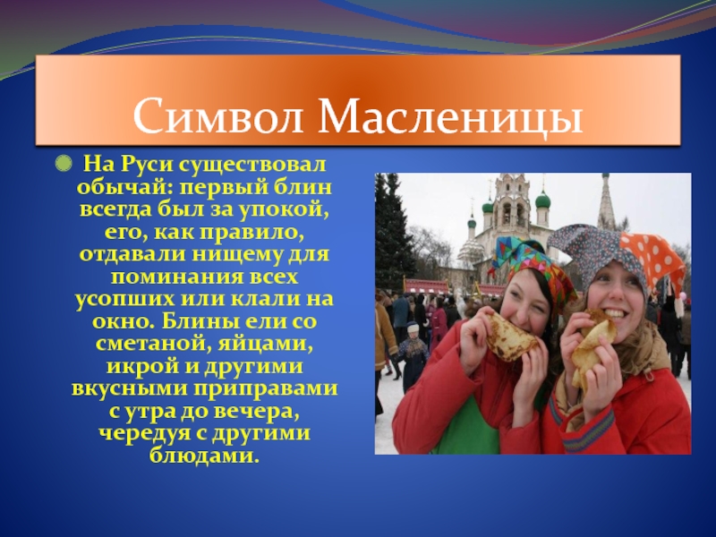 его, как правило, отдавали нищему для поминания всех усопших или клали на окно. Блины ели со сметаной, яйцами, икрой и другими вкусными приправами с утра до вечера, чередуя с другими блюдами.