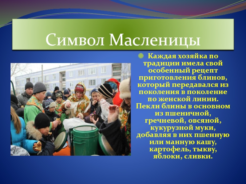 Масленицу встречали с величальными песнями на снежных горках. Символом Масленицы