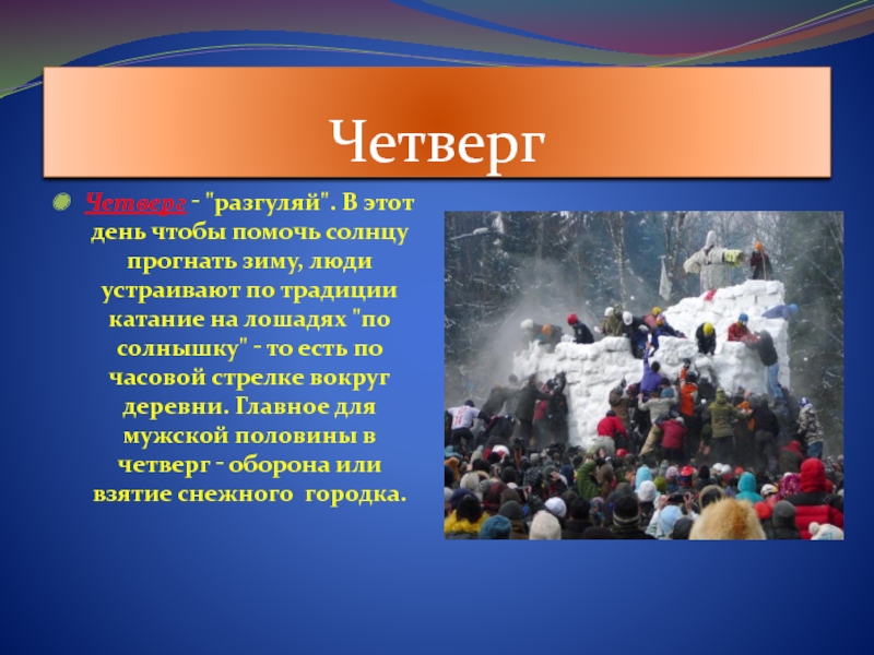 люди устраивают по традиции катание на лошадях "по солнышку" ‑ то есть по часовой стрелке вокруг деревни. Главное для мужской половины в четверг ‑ оборона или взятие снежного городка.