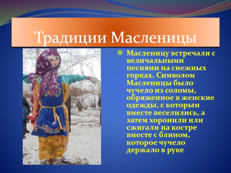 было чучело из соломы, обряженное в женские одежды, с которым вместе веселились, а затем хоронили или сжигали на костре вместе с блином, которое чучело держало в руке