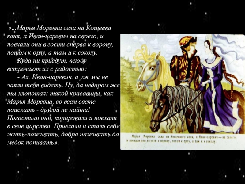 Слайд 15 «…Марья Моревна села на Кощеева коня, а Иван-царевич на своего,