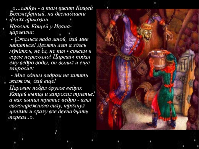 Царевич подал другое ведро; Кощей выпил и запросил третье, а как выпил третье ведро - взял свою прежнюю силу, тряхнул цепями и сразу все двенадцать порвал..».