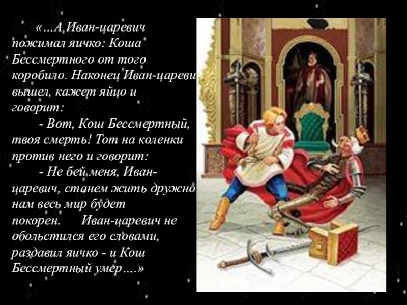 - Не бей меня, Иван-царевич, станем жить дружно; нам весь мир будет покорен. Иван-царевич не обольстился его словами, раздавил яичко - и Кош Бессмертный умер".