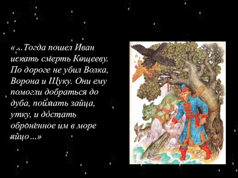 Слайд 7«…Тогда пошел Иван искать смерть Кощееву. По дороге не убил Волка,