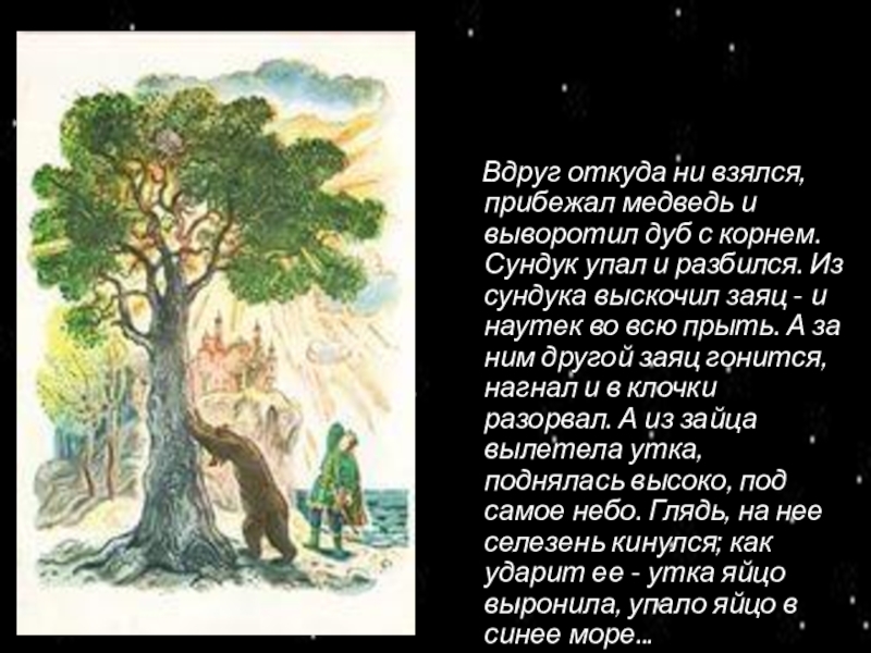дуб с корнем. Сундук упал и разбился. Из сундука выскочил заяц - и наутек во всю прыть. А за ним другой заяц гонится, нагнал и в клочки разорвал. А из зайца вылетела утка, поднялась высоко, под самое небо. Глядь, на нее селезень кинулся; как ударит ее - утка яйцо выронила, упало яйцо в синее море...