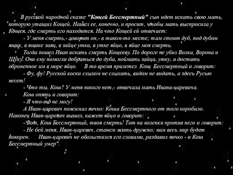 у Кощея Бессмертного. Трудно ее будет достать, нелегко с Кощеем сладить: его смерть на конце иглы, та игла в яйце, яйцо в утке, утка в зайце, тот заяц сидит в каменном сундуке, а сундук стоит на высоком дубу, и тот дуб Кощей Бессмертный как свой глаз бережет».