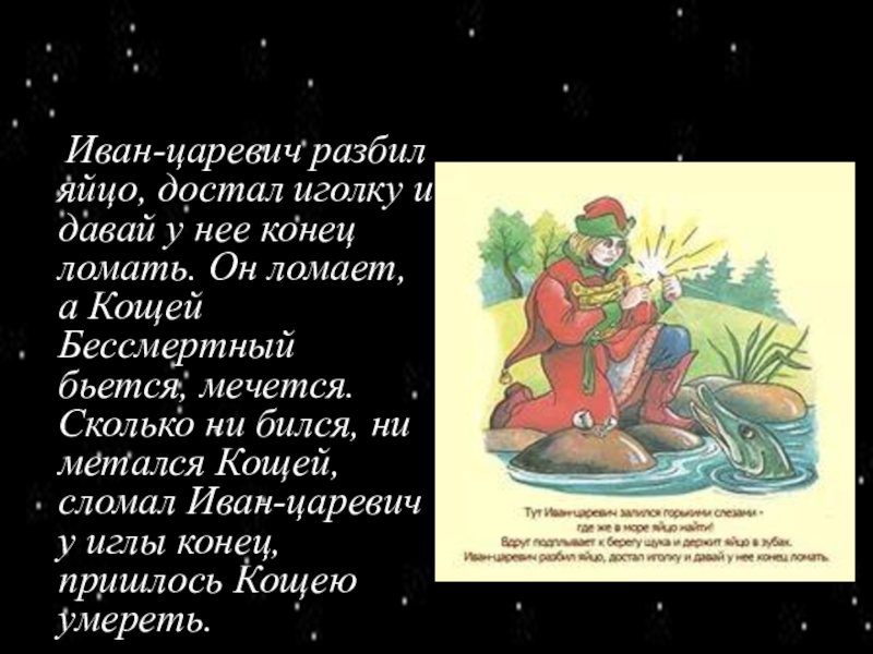 Слайд 19 Иван-царевич разбил яйцо, достал иголку и давай у нее