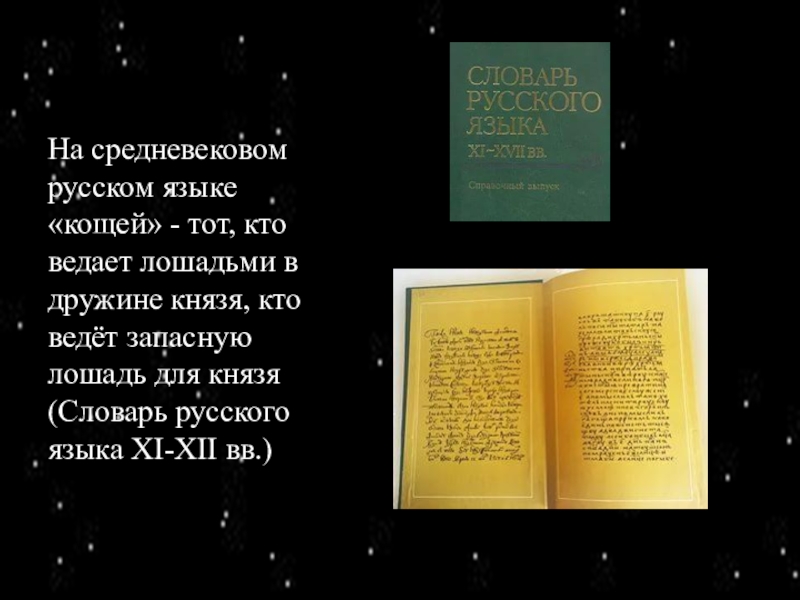 Слайд 23На средневековом русском языке «кощей» - тот, кто ведает лошадьми в