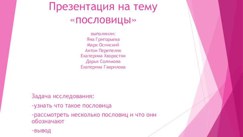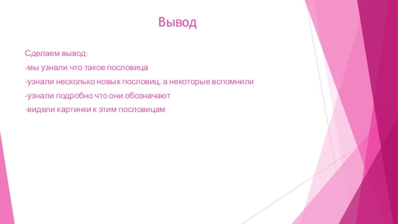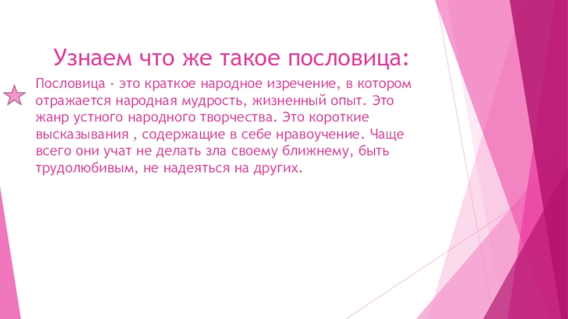 котором отражается народная мудрость, жизненный опыт. Это жанр устного народного творчества. Это короткие высказывания , содержащие в себе нравоучение. Чаще всего они учат не делать зла своему ближнему, быть трудолюбивым, не надеяться на других.