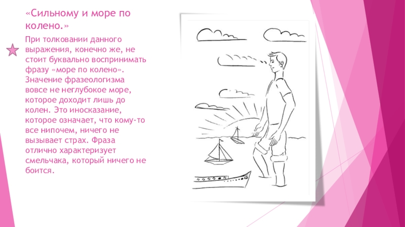 стоит буквально воспринимать фразу «море по колено». Значение фразеологизма вовсе не неглубокое море, которое доходит лишь до колен. Это иносказание, которое означает, что кому-то все нипочем, ничего не вызывает страх. Фраза отлично характеризует смельчака, который ничего не боится.