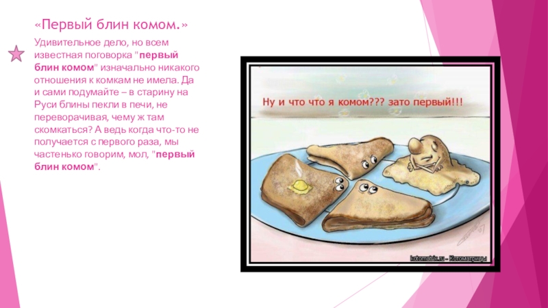 изначально никакого отношения к комкам не имела. Да и сами подумайте – в старину на Руси блины пекли в печи, не переворачивая, чему ж там скомкаться? А ведь когда что-то не получается с первого раза, мы частенько говорим, мол, "первый блин комом".