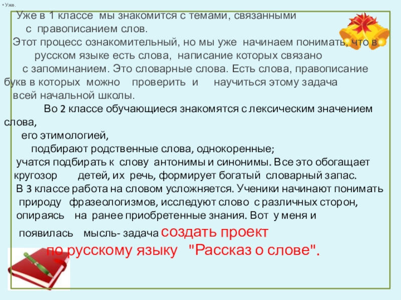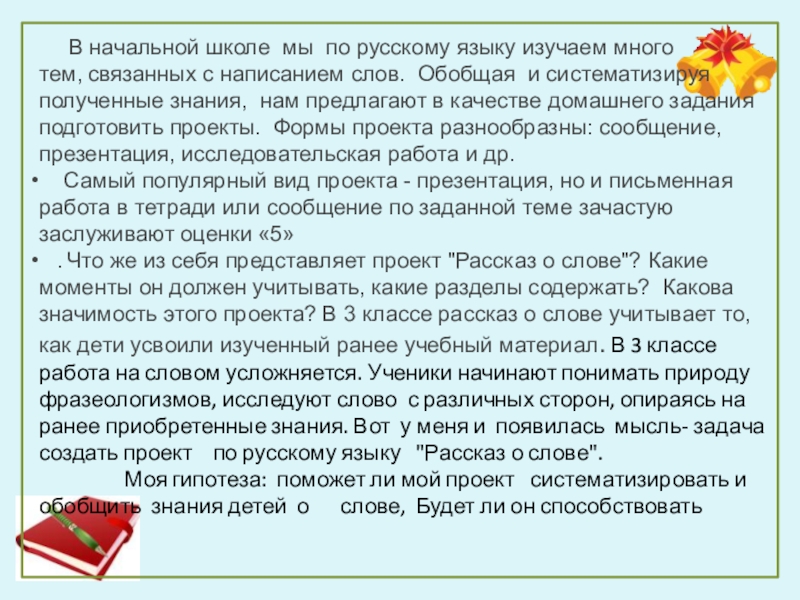 ранее приобретенные знания. Вот у меня и появилась мысль- задача создать проект по русскому языку "Рассказ о слове".