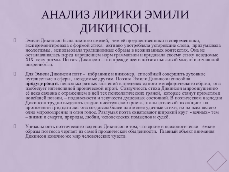 и современники, экспериментировала с формой стиха: активно употребляла устаревшие слова, придумывала неологизмы, использовала традиционные образы в неожиданных контекстах. Она не останавливалась перед нарушением норм грамматики и придавала своему стиху неведомые XIX веку ритмы. Поэзия Дикинсон – это прежде всего поэзия пытливой мысли и отчаянной искренности.