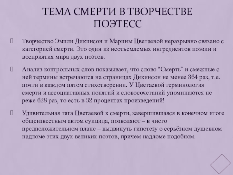 Анализ контрольных слов показывает, что слово “Смерть” и смежные с ней термины встречаются на страницах Дикинсон не менее 364 раз, т.е. почти в каждом пятом стихотворении. У Цветаевой терминология смерти и ассоциативных понятий и словосочетаний упоминаются не реже 628 раз, то есть в 32 процентах произведений!