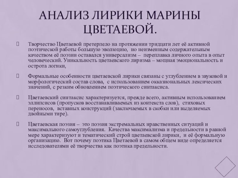 Цветаевская поэзия – это поэзия экстремальных нравственных ситуаций и максимального самоуглубления. Качества максимализма и предельности в равной мере характеризуют и тематический строй цветаевской лирики, и её формальную организацию. Вот почему поэтика Цветаевой в самом общем виде определяется исследователями её творчества как поэтика предельности.