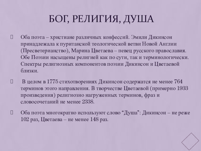 к пуританской теологической ветви Новой Англии (Пресветерианство), Марина Цветаева – певец русского православия. Обе Поэзии насыщены религией как по сути, так и терминологически. Спектры религиозных компонентов поэзии Дикинсон и Цветаевой близки.