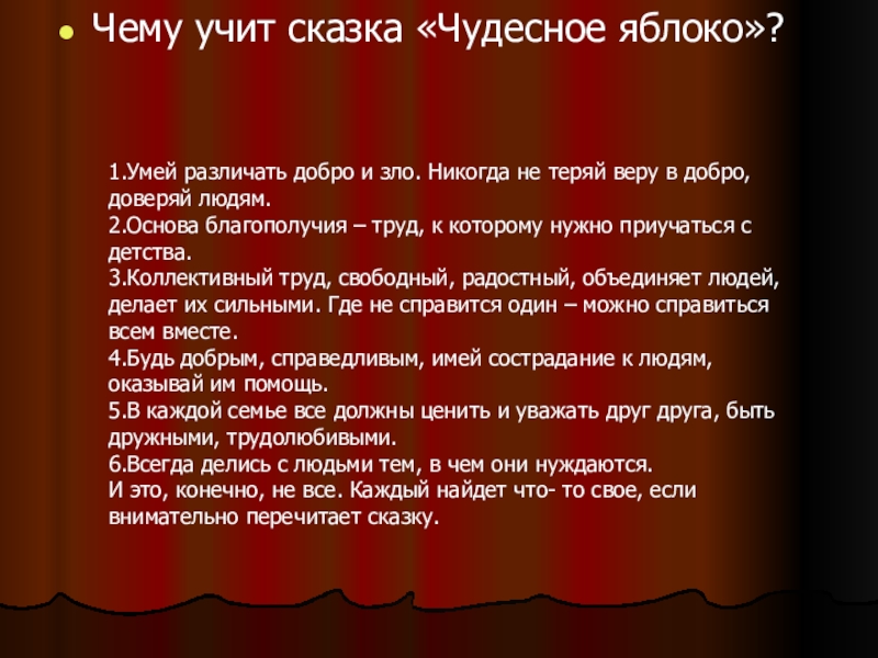 Чему учит сказка «Чудесное яблоко»?1.Умей различать добро и зло. Никогда не теряй веру в добро, доверяй людям.2.Основа