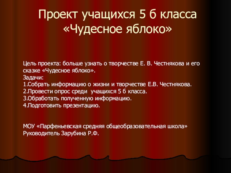 Проект учащихся 5 б класса «Чудесное яблоко» Цель проекта: больше узнать о творчестве Е. В. Честнякова и его сказке «Чудесное яблоко».Задачи:1.Собрать информацию о жизни и творчестве Е.В. Честнякова.2.Провести опрос среди учащихся 5 б класса.3.Обработать полученную информацию.4.Подготовить
