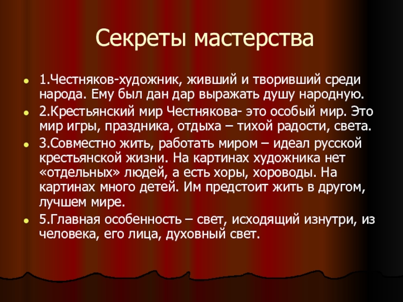 Секреты мастерства1.Честняков-художник, живший и творивший среди народа. Ему был дан дар выражать душу народную.2.Крестьянский мир Честнякова- это