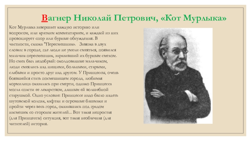 Кот Мурлыка завершает каждую историю или вопросом, или кратким комментарием, и каждый из них провоцирует спор или бурные обсуждения. В частности, сказка "Пересмешник». Завязка в двух словах: в городе, где люди не умели смеяться, появился мальчик-пересмешник, заразивший их бурным смехом. Но смех был недобрый: околдованные мальчиком, люди смеялись над нищими, больными, старыми, слабыми и просто друг над другом. У Принцессы, очень боявшейся стать посмешищем города, любимая кормилица оказалась при смерти, однако Принцесса могла спасти ее лекарством, данным ей волшебной старушкой. Одно условие: Принцессе надо было надеть шутовской колпак, кафтан и огромные башмаки и пройти через весь город, оказавшись под градом насмешек со стороны жителей... Вот такая непростая (для Принцессы) ситуация, вот такая необычная (для читателей) история.
