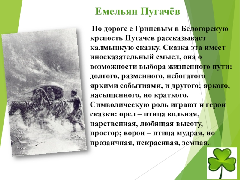 По дороге с Гриневым в Белогорскую крепость Пугачев рассказывает