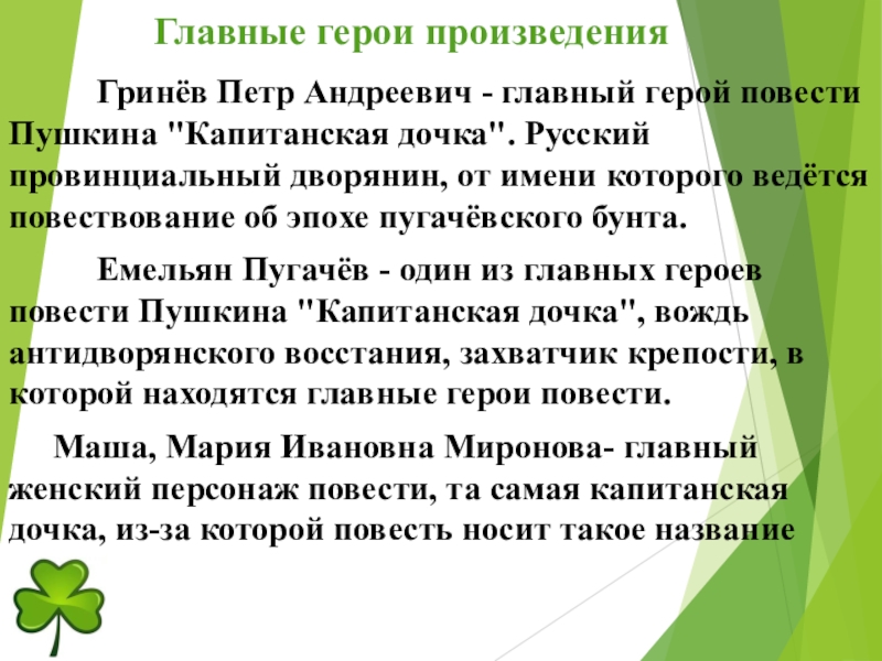 Маша, Мария Ивановна Миронова- главный женский персонаж повести, та самая капитанская дочка, из-за которой повесть носит такое название