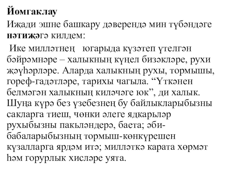 саклап калырга тиеш. Буыннан буынга күчә торган рухи тәҗрибә һәм йолалар вакытлар узу белән һич тә әһәмиятләрен югалтмыйлар, киресенчә, аларның кыйммәте арта гына. Бүгенге көндә милли бәйрәмнәребез, йола, гореф-гадәтләребез яңадан торгызылып, яңартылып, заман төсмерләре биреп үткәрелә башлады. Аларны халык белсә, хөрмәт итсә, милләт яши дигән сүз.