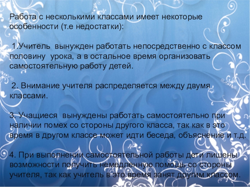 3. Учащиеся вынуждены работать самостоятельно при наличии помех со стороны другого класса, так как в это время в другом классе может идти беседа, объяснение и т.д.