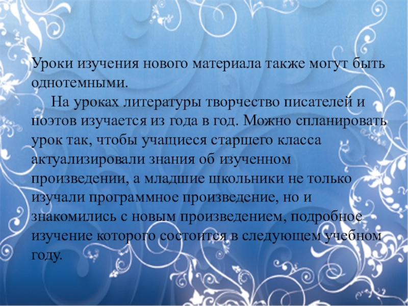 Слайд 6Уроки изучения нового материала также могут быть однотемными.