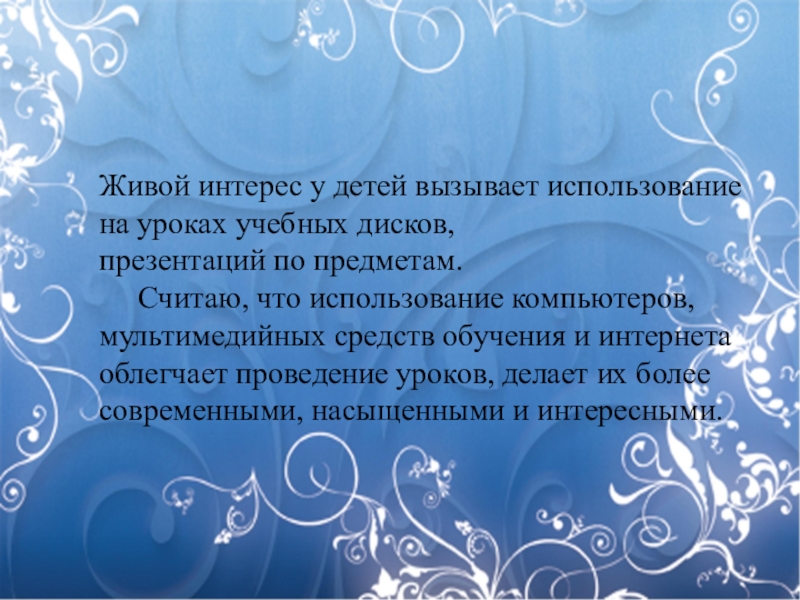 Считаю, что использование компьютеров, мультимедийных средств обучения и интернета облегчает проведение уроков, делает их более современными, насыщенными и интересными.