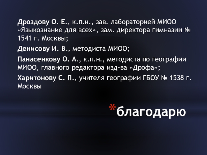 Панасенкову О. А., к.п.н., методиста по географии МИОО, главного редактора изд-ва «Дрофа»;