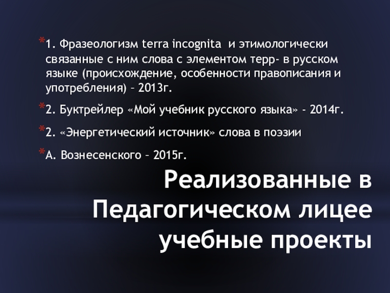 Слайд 15Реализованные в Педагогическом лицее учебные проекты