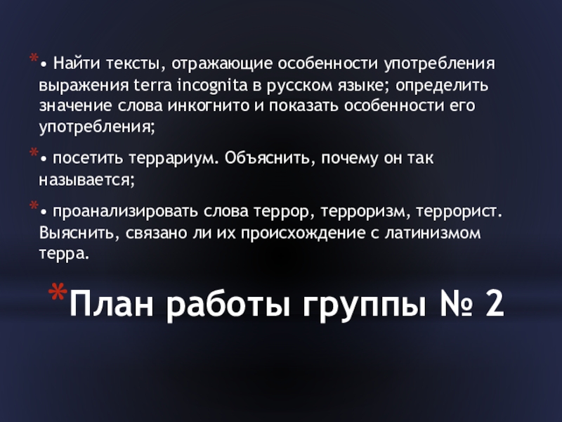 • проанализировать слова террор, терроризм, террорист. Выяснить, связано ли их происхождение с латинизмом терра.
