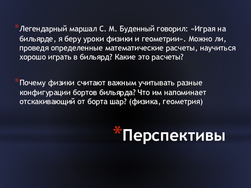 Легендарный маршал С. М. Буденный говорил: «Играя на бильярде, я беру