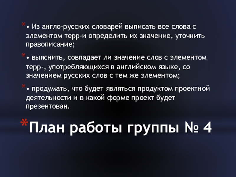 Слайд 20План работы группы № 4