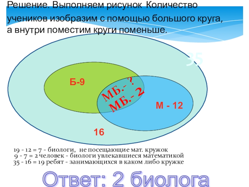 19 - 12 = 7 - биологи, не посещающие мат. кружок