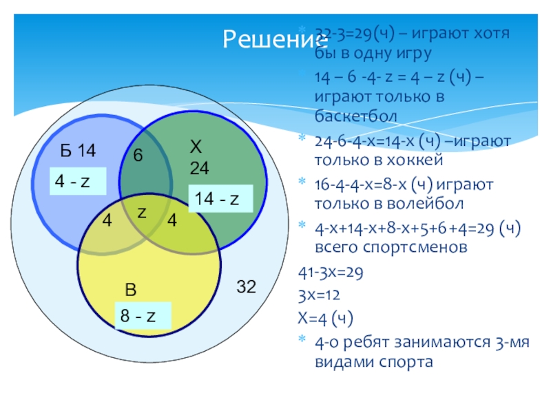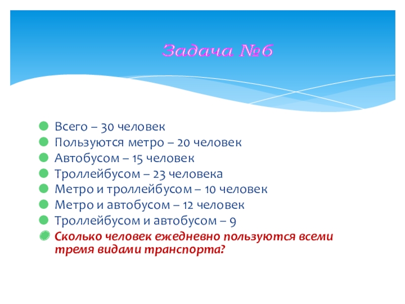 Аналогично получаем: х − 6 — только автобусом и х + 4 — только троллейбусом, так как всего 30 человек, составляем уравнение:
