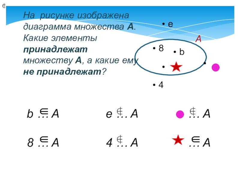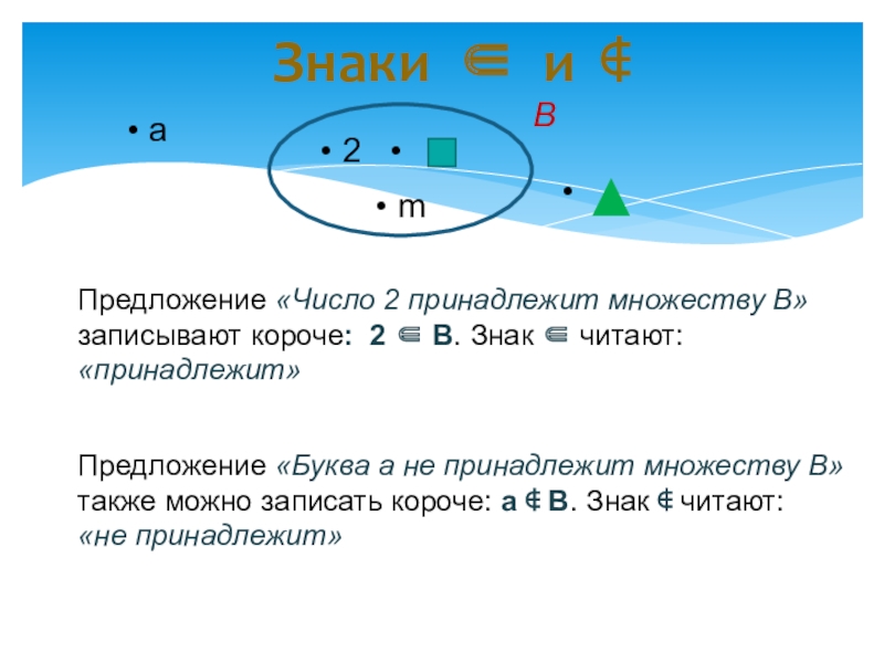 Предложение «Буква а не принадлежит множеству В» также можно записать короче: а ∉ В. Знак ∉ читают: