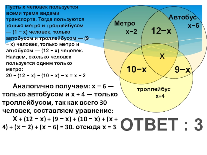 Пусть х человек пользуется всеми тремя видами транспорта. Тогда пользуются только метро и троллейбусом — (1 − х) человек, только автобусом и троллейбусом — (9 − х) человек, только метро и автобусом — (12 − х) человек. Найдем, сколько человек пользуется одним только метро: