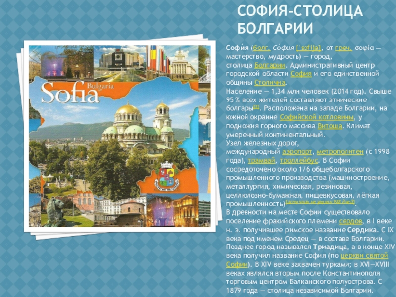 Софи́я (болг. Со́фия [ˈsɔfija], от греч. σοφία — мастерство, мудрость) — город, столица Болгарии. Административный центр городской области София и