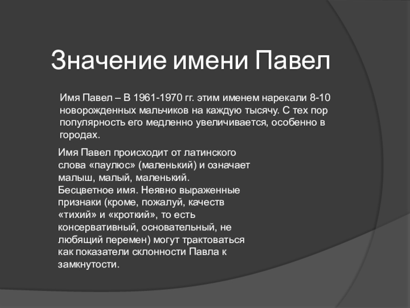 Имя Павел происходит от латинского слова «паулюс» (маленький) и означает малыш, малый, маленький.