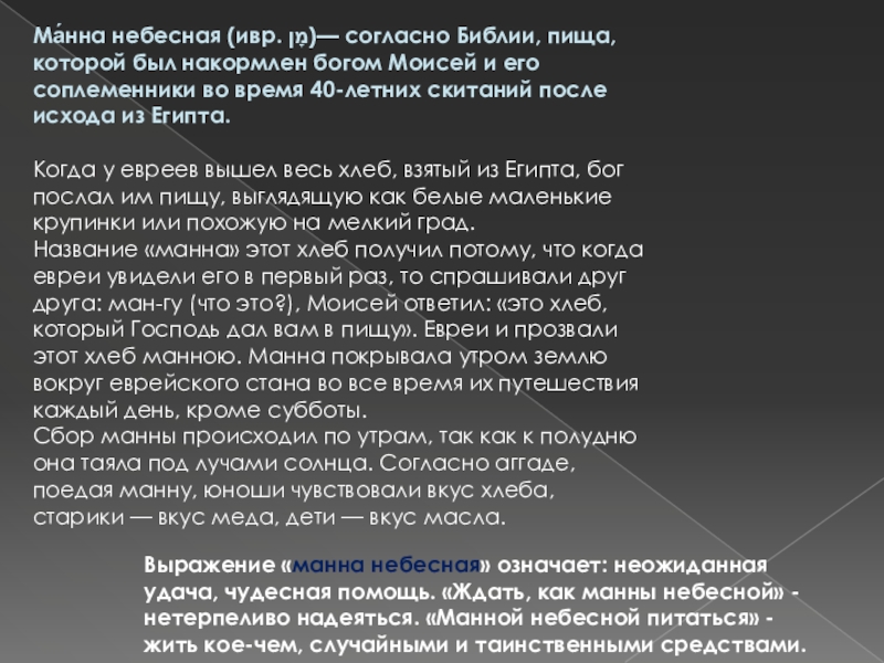 Выражение «манна небесная» означает: неожиданная удача, чудесная помощь. «Ждать, как манны небесной» - нетерпеливо надеяться. «Манной небесной питаться» - жить кое-чем, случайными и таинственными средствами.