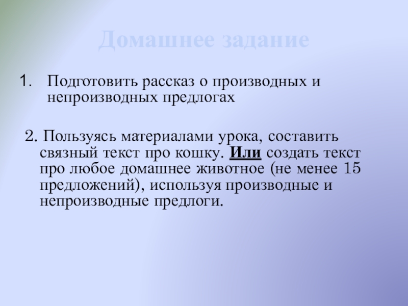 составить связный текст про кошку. Или создать текст про любое домашнее животное (не менее 15 предложений), используя производные и непроизводные предлоги.