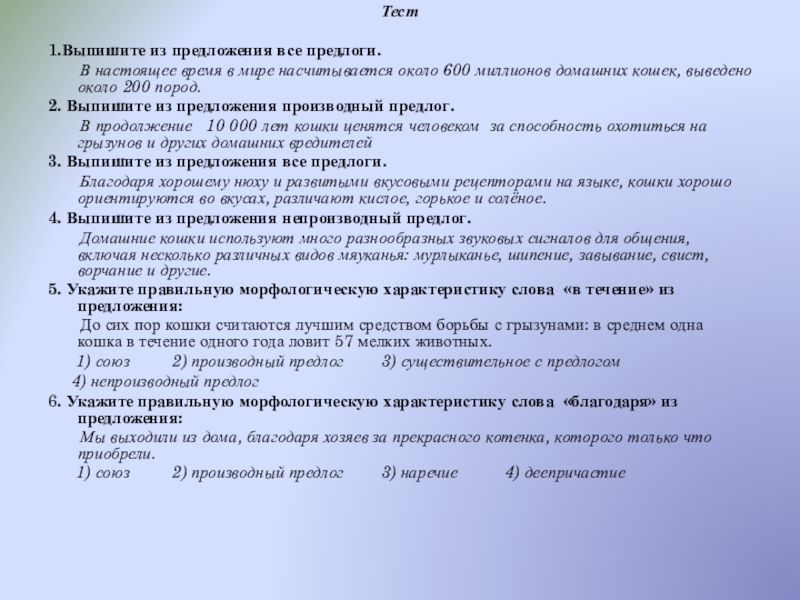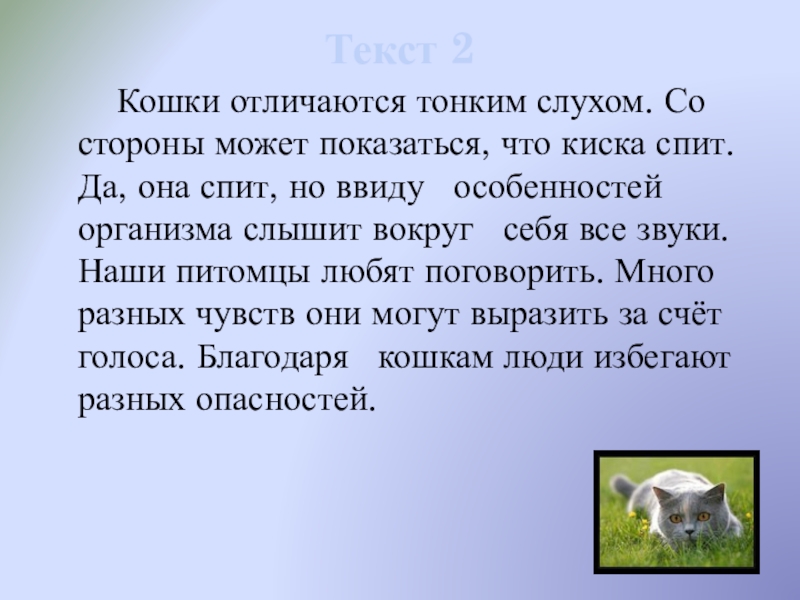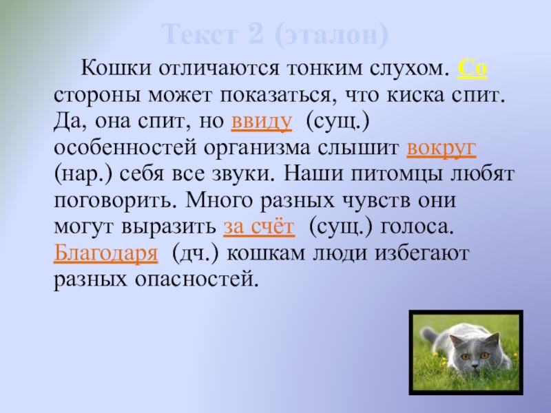 стороны может показаться, что киска спит. Да, она спит, но ввиду (сущ.) особенностей организма слышит вокруг (нар.) себя все звуки. Наши питомцы любят поговорить. Много разных чувств они могут выразить за счёт (сущ.) голоса. Благодаря (дч.) кошкам люди избегают разных опасностей.