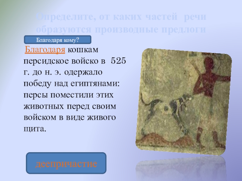 персидское войско в 525 г. до н. э. одержало победу над египтянами: персы поместили этих животных перед своим войском в виде живого щита.