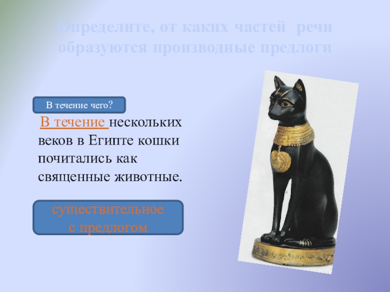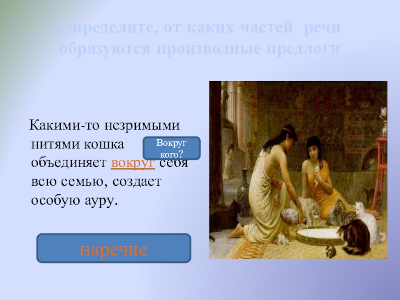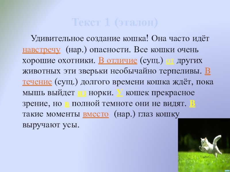 навстречу (нар.) опасности. Все кошки очень хорошие охотники. В отличие (сущ.) от других животных эти зверьки необычайно терпеливы. В течение (сущ.) долгого времени кошка ждёт, пока мышь выйдет из норки. У кошек прекрасное зрение, но в полной темноте они не видят. В такие моменты вместо (нар.) глаз кошку выручают усы.