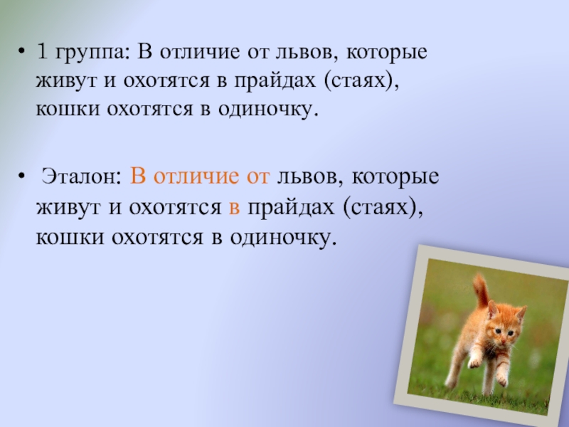 Эталон: В отличие от львов, которые живут и охотятся в прайдах (стаях), кошки охотятся в одиночку.