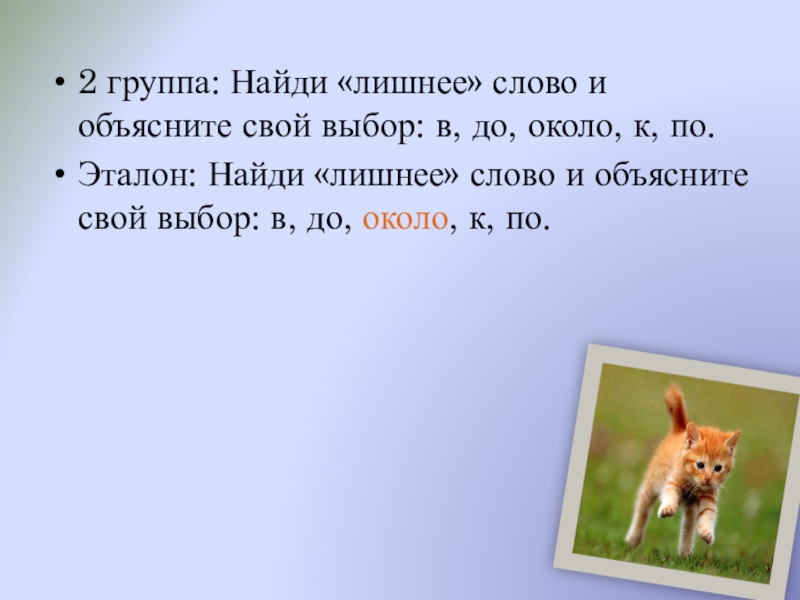 Эталон: Найди «лишнее» слово и объясните свой выбор: в, до, около, к, по.